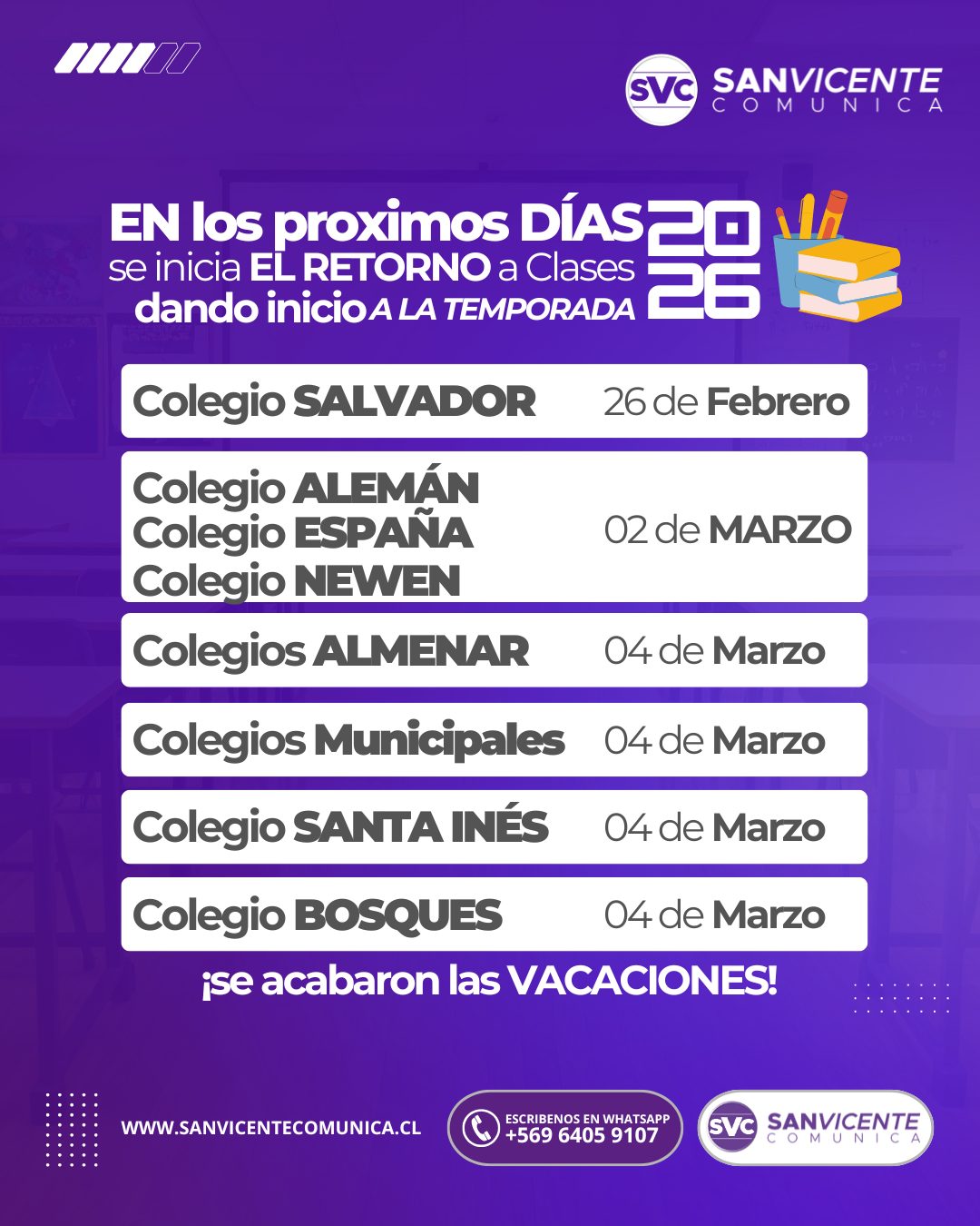 Se acerca el inicio del año escolar y con ello la vuelta a la rutina para cientos de familias en San Vicente. Terminan las vacaciones y comienza una nueva etapa marcada por desafíos, metas y el reencuentro de niños y jóvenes con sus comunidades educativas.